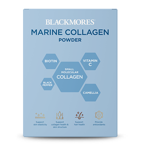 Blackmores Marine Collagen Powder combines hydrolysed collagen, vitamin C, biotin, black pepper seed extract and green tea extract powder to support skin elasticity and structure in convenient on-the-go sachets.