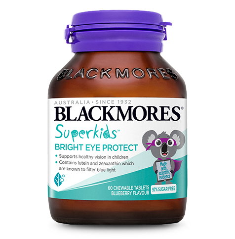 Blackmores Superkids Bright Eye Protect is a great tasting, blueberry flavored chewable tablet containing Lutein, Zeaxanthin, Zinc and other antioxidants to provide antioxidant support for healthy eyes.